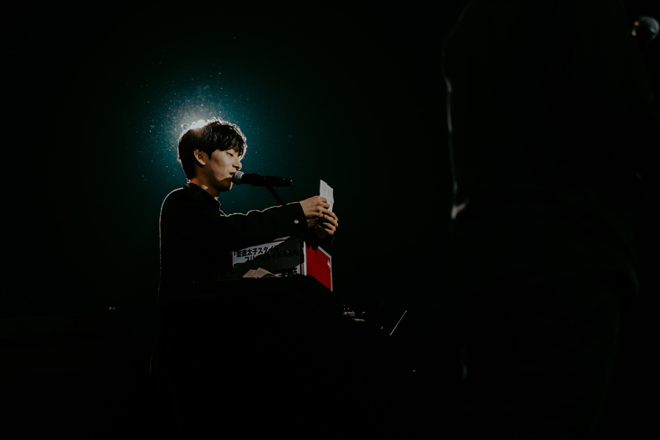 冒頭、客席エリアの中央に設けられたステージから突然二人が現れ、「スポットライト」でライブはスタートした。8月にリリースされたアルバム『かつて天才だった俺たちへ』より、菅田将暉とのコラボレート曲「サントラ」、アルバム収録曲「ヘルレイザー」、「耳無し芳一Style」などを披露していった。