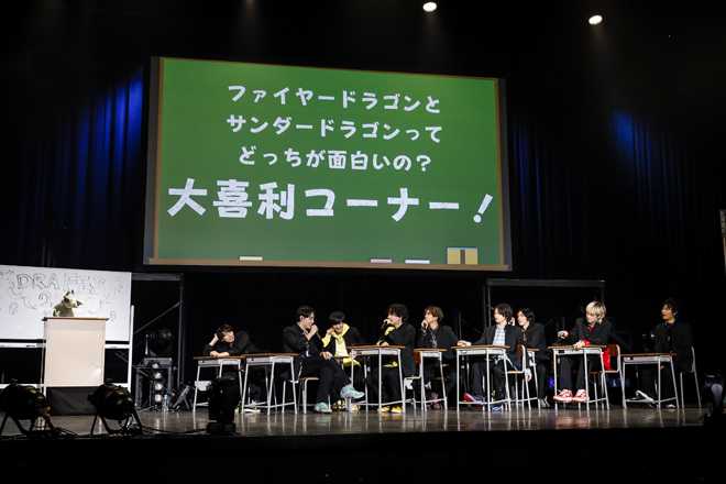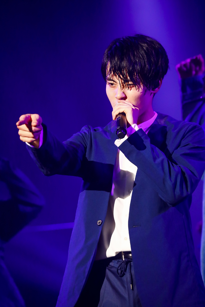 先攻のファイヤードラゴンは、ハードなラップ&ダンスが轟く「Gong」で、妖しくディープな世界へと視聴者を一気に引き込み、「Get Lite!」ではソロダンスも交えて、「これは学園祭レベルじゃない」というジャンの言葉を現実のものとする。一転、「MIKAZUKI」では古川がメロディックな歌声を放ち、志村や飯島もエモーショナルな表情で切なさをかき立てて、あふれ出す色気に学ランはもはや違和感満点。代わってサンダードラゴンは、「Take It To The Top」で友情に根差した野心を静かに燃やす一方、「真冬の熱帯夜」では松村のワイルドなラップや池田のセクシーな高音、柴崎の表情と身のこなしが年上女性への熱い恋心を巧みに表現して、こちらも大人びたムードを漂わせる。しかし、鉄板曲「リマカブロ!」ではアッパーなビートに乗ってエネルギッシュに拳を振り上げ、メンバー全員現役高校生の若さを爆発! 間奏ではファイヤードラゴンの面々も乱入し、ジャンと松村のヒューマンビートボックス対決に「ドア閉まりまーす」と伊藤が割って入ると、田中が「これ、電車じゃなくてバイクの歌なんだけど」と突っ込むという、微笑ましい一幕もあった。