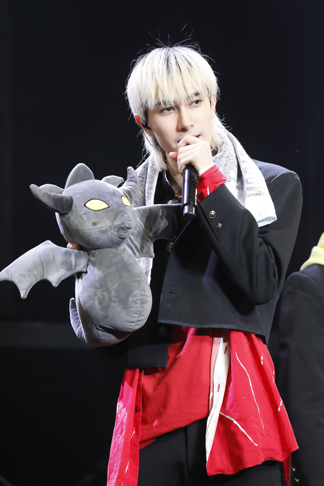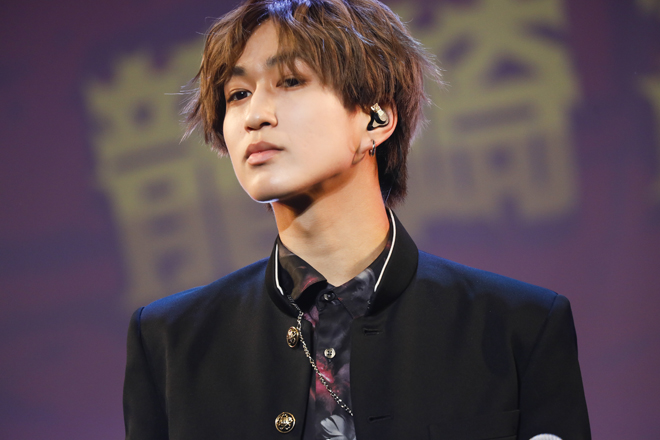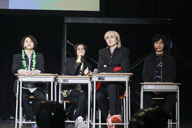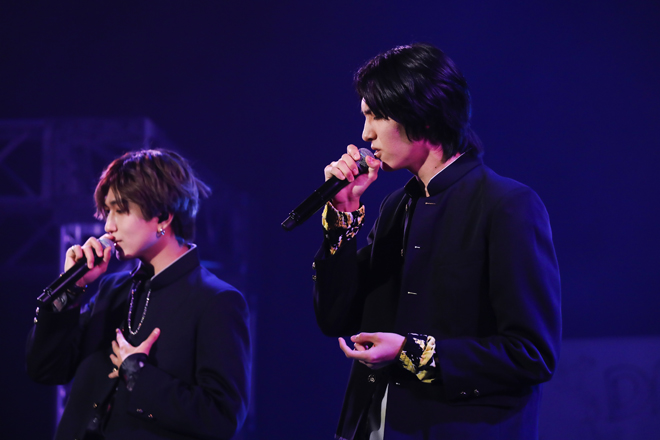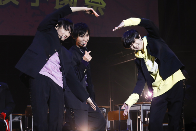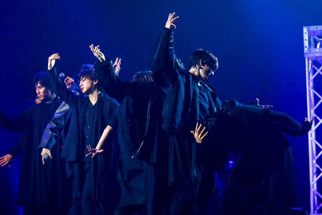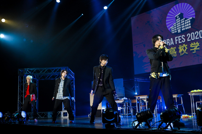 1部の“龍崎高校学園祭”では、メンバー全員が龍崎高校の学生となり、学校机と椅子の並ぶステージに学ラン姿で入場。彼らが龍崎高校の学生として登場するのは1年前の<DRA FES 2019>以来で、今日この時間をモンスター級の学園祭にしたいという想いの表れか、3rdシングル「Monster!」で学園祭の幕は開いた。赤を基調とした暗い照明の中、狂おしい恋情に身を焦がしながら歌い、踊る学ラン姿は妙に艶めかしく、透き通る声を聴かせる池田彪馬はカメラに向かって初っ端からウィンク。そこから疾走感満点の1stシングル「Pendulum Beat!」へと雪崩れ込み、学生服がピッタリの若々しい風を吹かせてゆくのも実に爽快で、パフォーマンスの安定感といい、表現のきめ細かさといい、装いは同じでも2年前からの進化は明らかだ。