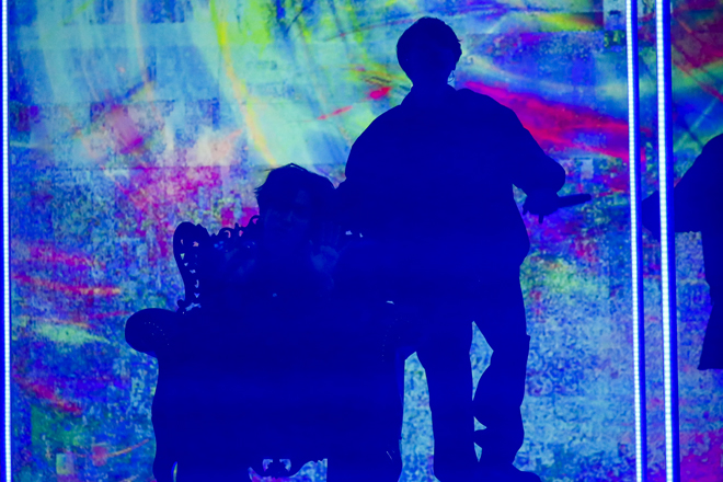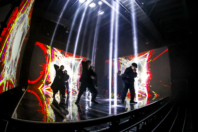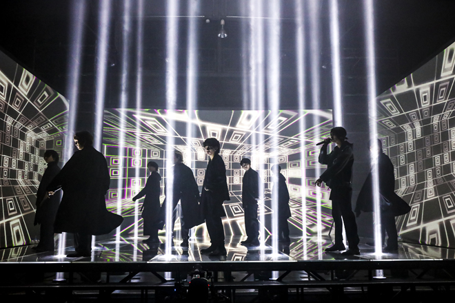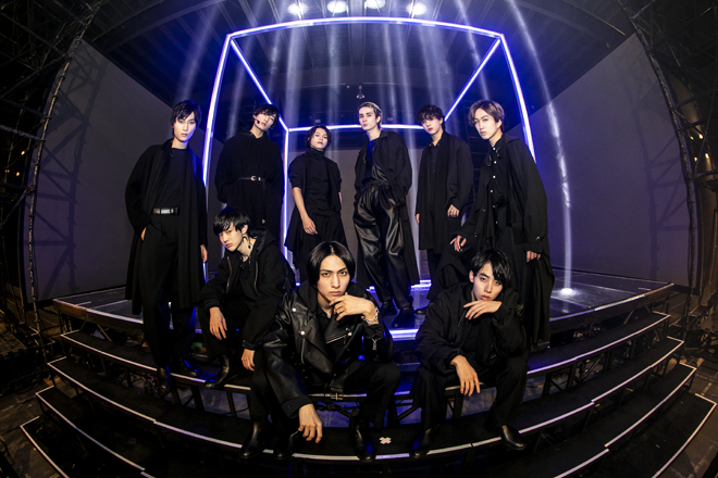 ステージパフォーマンスをシンプルに映した1部とは対照的に、ライブハウスを丸ごとステージとして使って、メンバーのフォーメーションの中まで深く切り込むカメラワークと映像により、幻想的なバーチャル世界を創り上げたのが2部の“BOX WORLD”だ。“ここを出られた者は誰一人としていない”と英文で綴られた意味深な映像に続き、幾何学のグラフィックが浮かぶ立方体の中に閉じ込められた9人が初披露したのは、12月23日にリリースされる『Burn It Black e.p.』の1曲目にあたる「BLACK BOX」。ジャンと松村の歪んだボーカルで幕開け、出口を探すかのように腰を落とし、床を踏みしめる9人のアクションは、まるで袋小路に追い込まれたような2020年の全世界を表すかのよう。しかし、田中の手招きから「hide-and-seek」が始まると全員箱の中を飛び出し、会場内の廊下やトイレの中に至るまで、自身を追うカメラとタイトル通りのかくれんぼを繰り広げる。追われる者の反逆を表すかのような勇ましいナンバーから、再びフロアにたどり着いた9人がいるのは箱の外。今、閉じ込められているソコは、本当に自分の力では抜け出せない場所なのか? そんな衝撃的なメッセージを叩きつけて、“BOX WORLD”の火ぶたは切って落とされた。