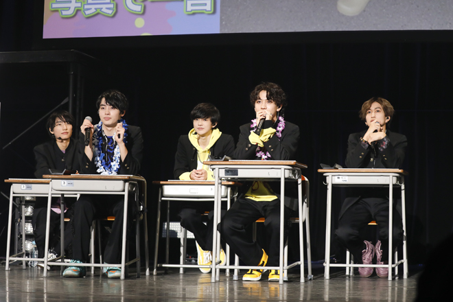 トークパートでは5年間を振り返り、去年の夏には海外での写真集撮影から帰国するなりCM撮影があった等のレアな話も。レアなのはライブパフォーマンスも同様で、ここからは5年で生まれたグループ内ユニットが次々に登場し、普段はマイクを持たないメンバーも全員が歌声を披露した。まずは田中洸希、池田、松村和哉の通称W.G.B(ワルガキボーイズ)が、ヤンキー感たっぷりに「Cross Counter」をドロップすると、「お前らブチ上がっていけ!」と声をあげたジャン海渡に、古川毅と志村玲於の3人が「ゲラゲラ」で躍動。そして飯島颯、伊藤壮吾、柴崎楽の3人で「NICHIYOUBI」を爽やかに歌いあげ、柴崎が「皆さん、学園祭楽しんでますか?」と手を振れば、最後は3人揃って腕でハートを形作る。その様子を後方でにこやかに見守っていたメンバーたちも最後は全員前へと飛び出し、夢への決意を綴った「Endless Dance」を爽快に歌い上げて、満面の笑顔を見せてくれた。