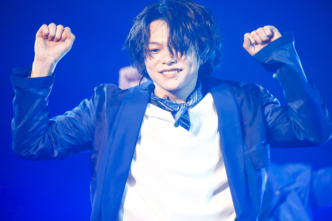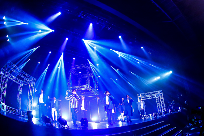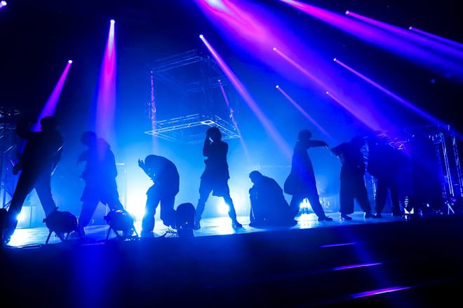 その理由は、続く映像で明らかになった。“この矛盾だらけの世の中の当たり前を疑え”“自分は何も知らないと、知ることが大切なのだ”“そう、絶体絶命は、絶好の機会”等、冒頭の「BLACK BOX」に通じるメッセージをぶつけてカメラがステージに戻ると、なんと黒づくめからブルー&ホワイトに着替えたメンバーの姿が。タワーに登ったメンバーたちに画面上では銃口の照準が定められ、それでも平然と「Dragonfly」を歌っていられるのは、この曲に書かれている通り仲間への信頼があるからなのだろう。そして9人が横一線に揃い、一丸となってぶつけたのは、7月に配信リリースされたセルフタイトル曲「SUPER★DRAGON」。“俺達が時代を変える”と歌いながら前に進み出る池田の表情は決然たる頼もしさにあふれ、ダンサーたちも汗を飛ばしながら身体いっぱいで曲の想いを訴えてゆく。そして「今年最後のライブなのに、そんなんでいいのか! もっともっとテンション上げて、熱くいこうぜ!」という志村の煽りからは、さらなる汗だくゾーンへ。デスボイスを轟かせる松村を筆頭に全員で叫びあげるメタルチューン「BADASS」に、古川の「ただじゃ帰さねぇぞ!」という物騒な宣言からの「Untouchable MAX」では、田中のヒューマンビートボックスも冴えわたって、歌詞の通りの“情動 暴走 阿鼻叫喚”を実現。曲を終えて息を切らす様までが美しく、例えようもなくドラマティックだ。
