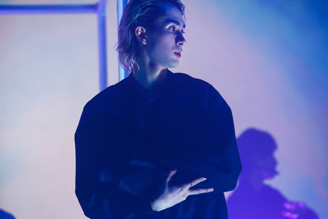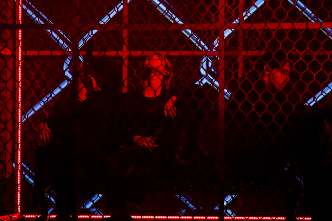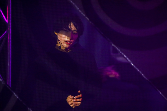 赤の色味が強かった前2曲から一転、青へと印象が変わったのは「Don’t Let Me Down」と「City Noise」。エレクトロにトロピカルハウスといった涼やかなサウンドで、リアルな現実からフィクションのラブストーリーへと観る者を誘いながら、古川は「導いてくれよ“BOX WORLD”」と歌詞を歌い替え。彼と池田の2ボーカルが掛け合うフェイクもグッと堂に入って、その前で踊る7人との対比といい、9人揃ってのグルーヴといい、目と耳を優しく楽しませてくれる。紫の光に包まれた「Ringing,Love」でも、巧みに織り交ぜられたラップ&ボーカルがひと夏の恋愛模様を巧みに描き出すが、直後の「Set It Off」では金網に囲まれた箱の中にジャン、田中、松村の3ラッパーが閉じ込められ、金網を摑みながら憤怒にまみれた激情ラップを放出。その周りで展開される他メンバーのダンスは、まるで彼らが怒りを向ける社会の縮図のようにも映って背筋が寒くなる。しかし「La Vida Loca」では金網の中から脱出して、太陽の灼熱を思わせるようなゴージャスな映像とラテンなリズムをバックに、挑発的なラップを畳みかけ。しかし、闘いの対象はもはや他人ではなく、己へと向けられたものだ。