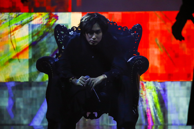 「Mr.GAME」ではフロアの各所に組まれたタワーにメンバーが駆け上がり、ダイナミックで立体的なステージングを展開。“彷徨う仮想(ヴァーチャル)と現実(リアル)のはざま”という歌詞がこんなにしっくり来るのも、縦横無尽に居場所を変える彼らを画面越しでどこまでも捉えられる配信ライブならではだろう。続くMCで古川が口にした「初っ端からこんな黒ずくめの男たちに翻弄されているところだと思いますが」という台詞がそのままズバリなのが、悔しくも嬉しい。それぞれの自己紹介を挟み、「世の中には開けてはいけないものがたくさんあります。けど、開けてからじゃないと見えないものもあると思います。「Let’s open the PANDRA BOX」というジャンの言葉に続いたのは、もちろん「PANDRA」。この曲をプロデュースした池田だけが箱の中でゴージャスなアームチェアに腰掛け、支配者のように歌う周りを8人が取り囲んで蠢くというエモすぎる視覚インパクトに、視聴中のファンからも言葉にならない悲鳴が届く。さらに「WARNING」では、二手に分かれたパフォーマンスを映像で繋ぐことにより、マイクを握る古川、ジャン、田中のいる空間を、逆に池田が外側から覗き込んでいるかのような光景に。シチュエーションの反転に脳味噌が覚える心地の良い混沌は、視聴者のコメントを借りるなら“目から摂取するタイプの合法ドラッグ”である。