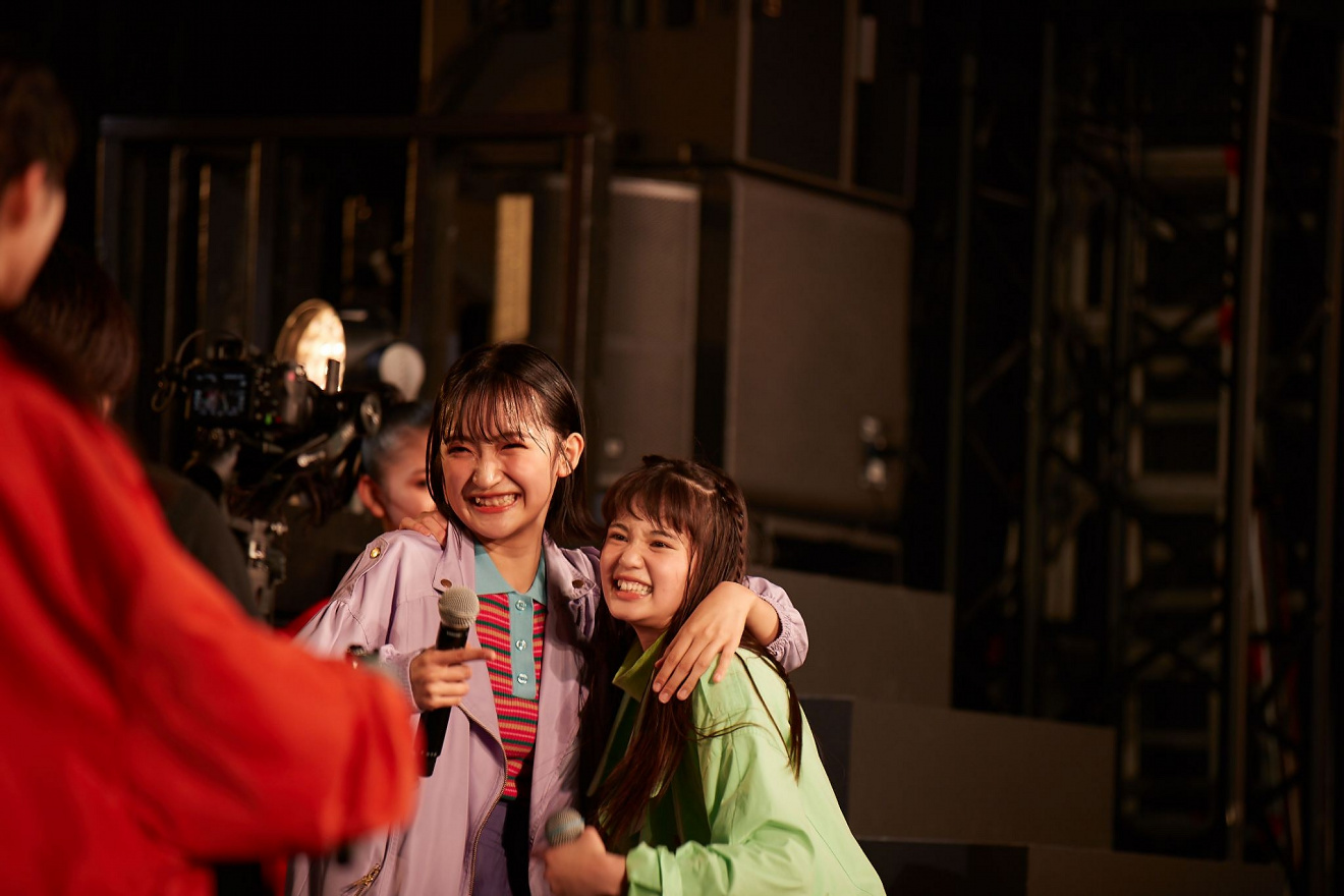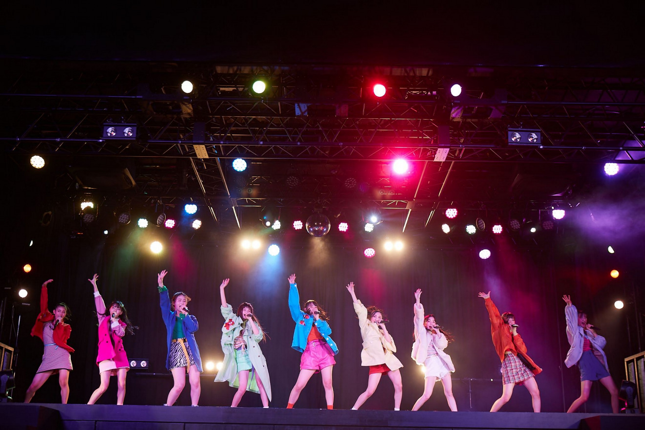 続くMCでは、この披露した2曲が大好きだという隅谷百花に「どのくらい?」と聞くメンバー。もちろん隅谷は全力で「このくらい!」と大きく身体を伸ばして応えて、笑いを誘う。そんな彼女たちのやりとり1つ1つに青春感が漂う。そんな今この瞬間ならではの煌めきを凝縮した「スキップ!」を切なく歌い上げると、まだあどけなさが残る9人の過去映像も流れて、そのままリクエストメドレーに。