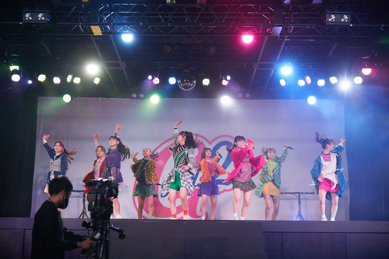 気づけばメンバーは衣装をチェンジし、「#わたモテ」「#オンラインライブ」と描かれたTikTok画面調のスクリーンで「私がモテてどうすんだ」を歌い、踊る。さらに「JEWEL GIRL」では、バーカウンターからワンカメショーのようにステージ移動を見せていく。メンバーがジュースで乾杯したり、ポップコーンやキャンディを抱えながら集合し、ラストはステージで原田が持つスマホで9人セルフィー。キレキレに踊る姿も、ワチャワチャと絡む様子も、いずれもGirls²の大きな魅力。それを余すことなく伝えていく演出が目白押しだ。