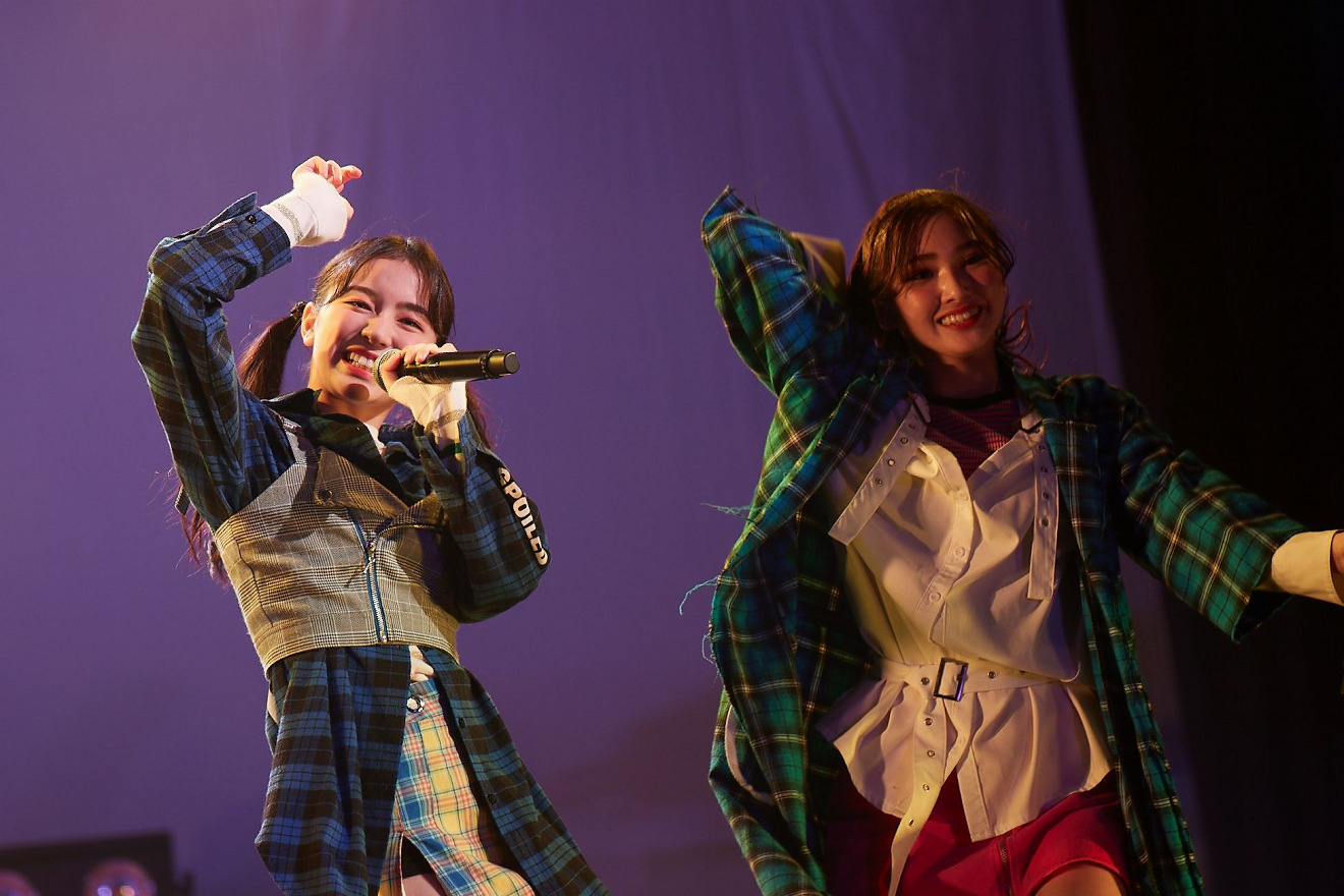 リアルなステージが映し出された後も、Girls²のロゴが空中に浮かぶオンラインライブならではの演出が楽しい。そのまま、彼女たちのハジける笑顔とともに「チュワパネ!」がスタート。キレのあるダンスと息の合ったフォーメーションチェンジに、このライブに向けてリハーサルを重ねてきた9人のアツい想いが伝わってくる。「Ring Ring♪」「ABCDEFガール」と歌い踊れば、すでにメンバーの額には汗が光る。「みなさんまだまだ盛り上がっていきましょう!」と最年少の菱田未渚美が呼びかけ、元気いっぱいなライブが幕を開けた。