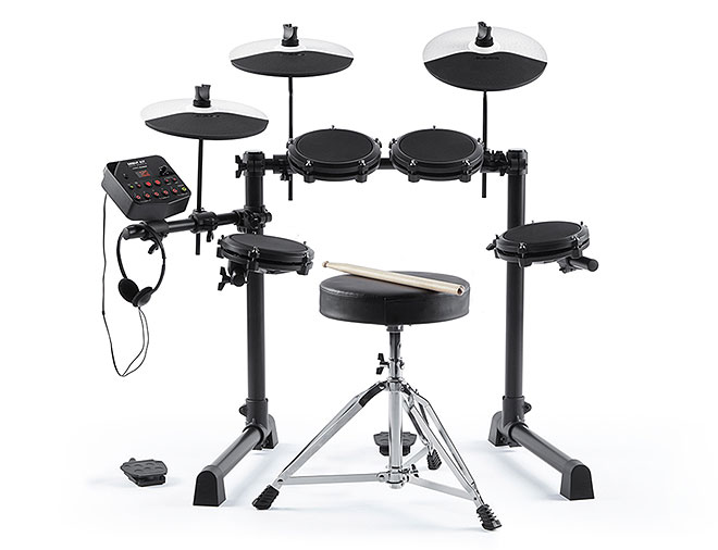 ▲メッシュヘッド・ドラム×4、シンバル×3、バスドラム/ハイハット用フットペダル、金属製マウントラック、ドラムモジュール、ヘッドホン、ドラムスローン、ドラムスティックをパッケージ。