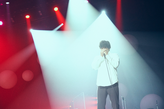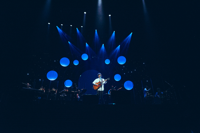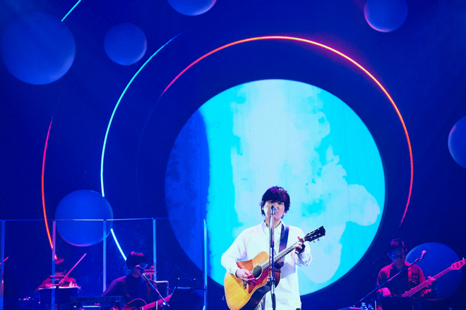 まず興味深いのは今回のバンドメンバーである。アルバムの共同サウンドプロデューサーであるトオミ ヨウ(Key)を中心に鈴木正人(B)、朝倉真司(Dr)という常連組、そして若手のシンリズム(G)を起用。さらに室屋光一郎(Vn)率いるストリングスカルテットがほぼ出ずっぱりの構成となっている。『コペルニクス』は生音と打ち込みの融合がひとつのテーマだったが、ライブにおいてもアコギや弦のぬくもりある響きと、SE、シンセベース、電子ドラム等のクールな音色の交わりが独自の世界を作っていた。
