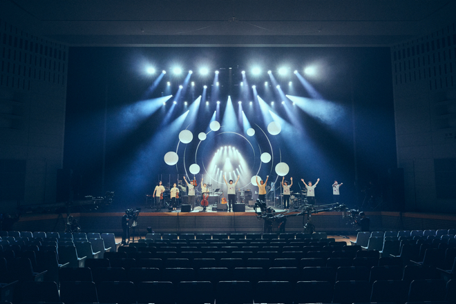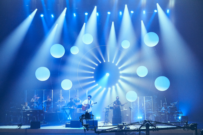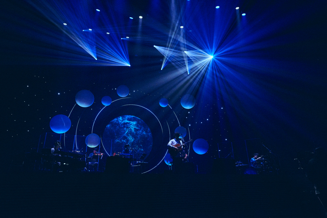 ライブは水面に映る地球のような映像ではじまった。『コペルニクス』収録の印象深いインストゥルメンタル「天動説」が流れる中、メンバーが登場する。1曲目に演奏されたのは「9inch Space Ship」。光と影が美しく交錯する舞台で、ストリングスが乗ったバンドサウンドが躍動する。