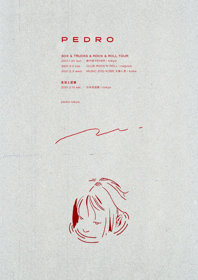 2021年2月13日(土)に東京・日本武道館で単独公演<生活と記憶>を行うPEDRO。<SOX & TRUCKS & ROCK & ROLL TOUR>では同公演に先立って、1月24日(日)東京・新代田FEVER、2月2日(火)愛知・CLUB ROCK’N’ROLL、3日(水)兵庫・MUSIC ZOO KOBE 太陽と虎の3公演が開催される。
