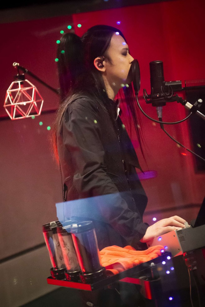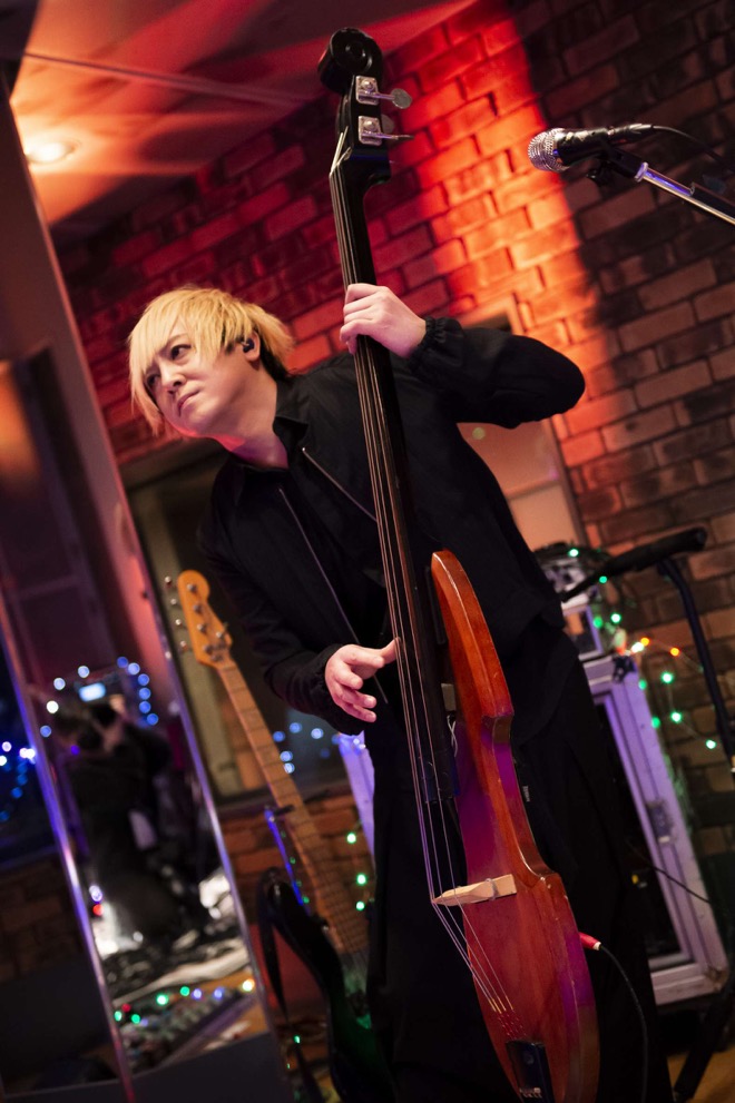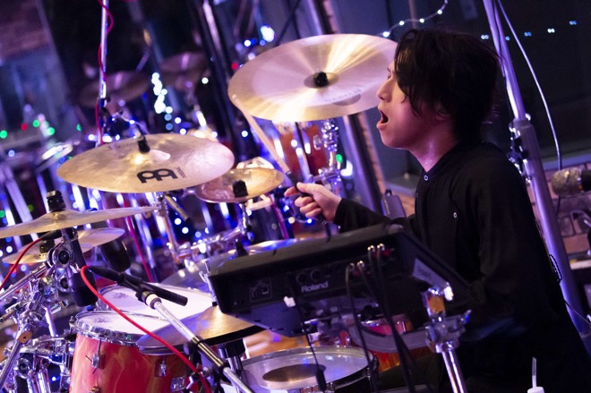 ライヴはヘヴィチューンの「惡-JUSTICE-」からスタート。始まると同時に、SATOち(Dr)のドラムセットに向かってミヤ(G)とYUKKE(B)が円を描くように立ち、逹瑯(Vo)と生ピアノを弾く吉田トオル(サポートKey)は別ブースに入るというフォーメーションにオッ!?と思った。さらに、ギターとベースのキャビネット(スピーカーボックス)も独立したブースに入れて、マイクを立てているようだ。この形ならドラムの遮音などをせずに生ピアノを鳴らせるし、ギターやベースの音量も自由に上げられる。つまり、今まで以上にこだわった音作りができるというわけだ。