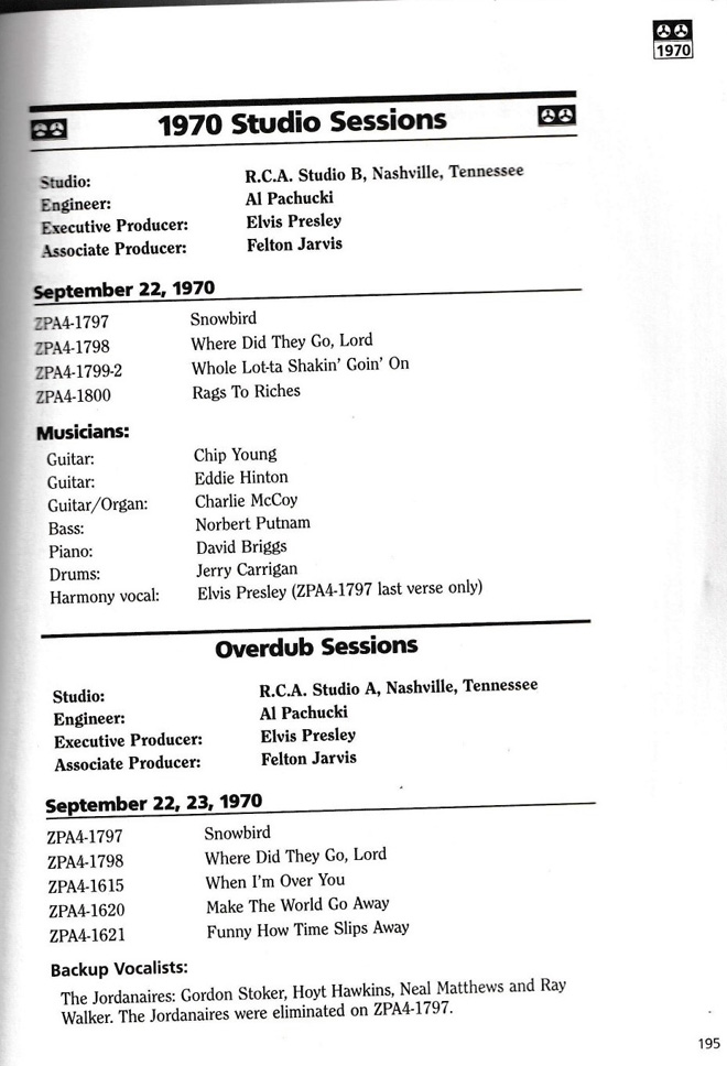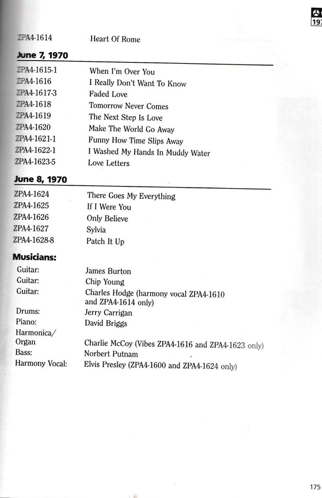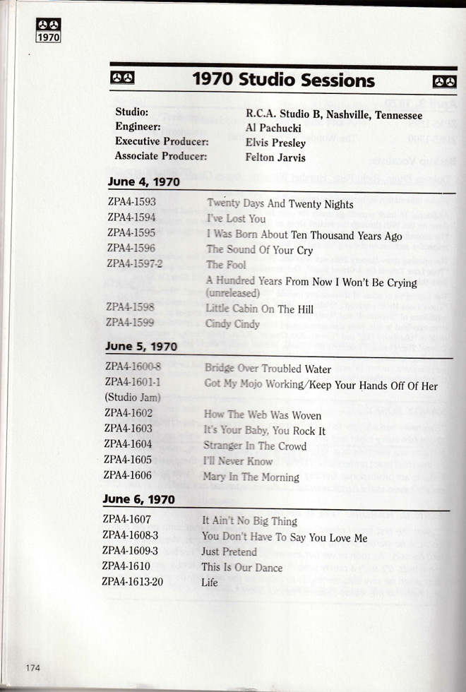 エルヴィスが50年前の1970年6月、9月にRCAナッシヴィル/スタジオBでレコーディングを行ったがちょっとJoseph A. Tunziの「ELVIS SESSIONS:Recorded Music of Elvis Aron Presley 1953-1977」(何百回と参考にさせて貰っている)からデータを掲載させてもらうと…、
