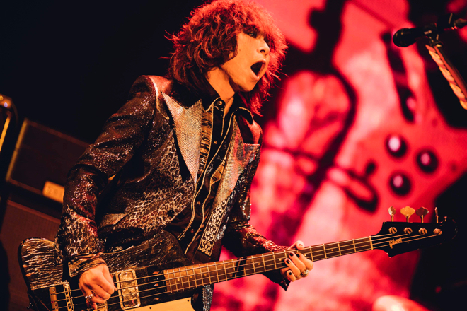 各公演ごとに異なる選曲で行われている<30th Anniversary LIVE>、この日のステージは2ndアルバム『EXPERIENCE MOVIE(未公開のエクスペリエンス・ムービー)』のナンバー「LOVE IS ZOOPHILIA」からスタート。エマ/ヒーセ/アニーが一丸となって繰り出すグラムロックの熱量を、そのまま7thアルバム『PUNCH DRUNKARD』の「セックスレスデス」へと注ぎ込み、さらに6thアルバム『SICKS』から「TVのシンガー」「創生児」、『PUNCH DRUNKARD』の「クズ社会の赤いバラ」、そして再集結後の最新アルバム『9999』から「Breaking The Hide」と次々に楽曲を披露していく。