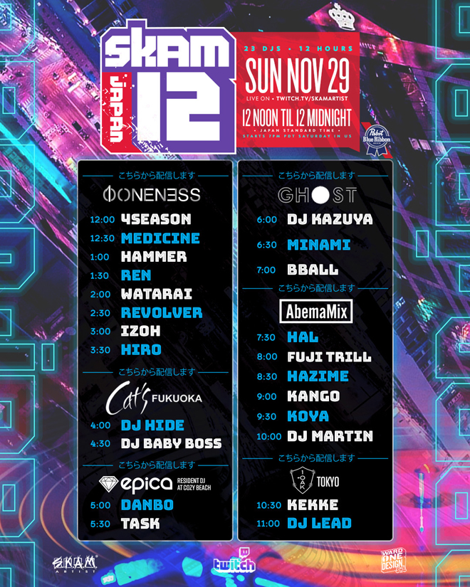 そんなSKAM ARTISTによるオンラインイベントには、日本全国からDJを23名選抜しLAから全世界へ向けて12時間TWITCHで配信される。