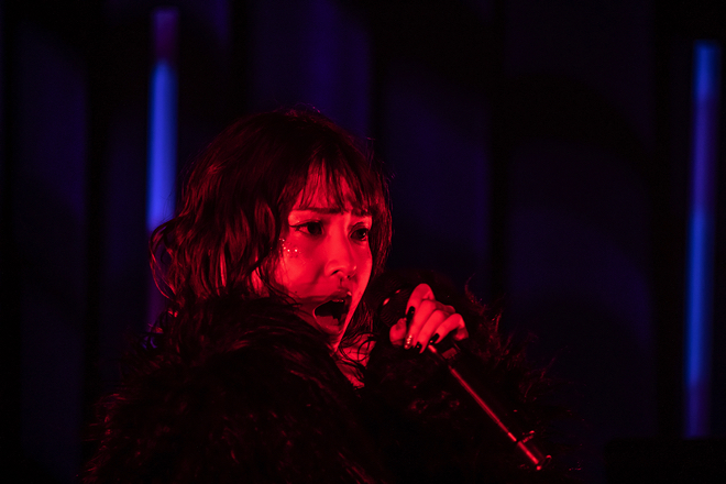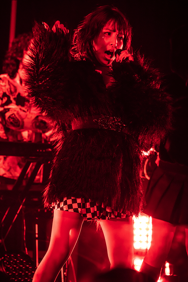 重厚なサウンドの中、照らし出す赤や紫のライトが黒い衣装に身を包んだyukaDD(;´∀`)を妖艶に映し出す。圧倒されるパワフルな歌声もさることながら、グローバルでの活躍を見据えてレッスンに励んでいるという中国語にも驚かされる。