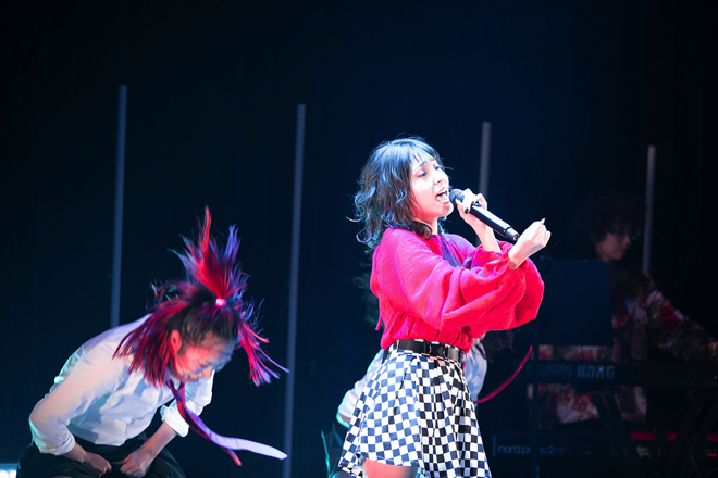 続いて披露されたのは、この音源を聴いた各国のワーナーミュージックの重役に「日本にもこんな素晴らしい楽曲を歌えるアーティストがいたのか!」と言わしめたという「HIGH SCHOOL FUNK!!!」。真っ赤な衣装へと切り替わり華やかさが増した中、高らかなシャウトから曲がスタート。yukaDD(;´∀`)のもう一つの魅力である、ダンスが惜しみなく盛り込まれたアッパーソングとなっており、彼女自身も今までライブができなかった鬱憤を晴らすかの様に楽しみながら歌っているのがダンスや動きから伝わってくる。