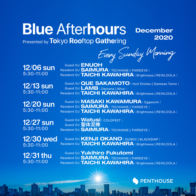 原宿Sankeys PENTHOUSEにて12時間のデイパーティとして開催され、毎回熱狂的な盛り上がりを見せ人気を集めている<Tokyo Rooftop Gathering>監修の元、毎週日曜日朝にアフターアワーズ企画<Blue Afterhours>が2020年12月6日(日)より始動する(編注:ブルーアワー/blue hourは、日の出前と日の入り後に発生する空が濃い青色に染まる時間帯のこと)。