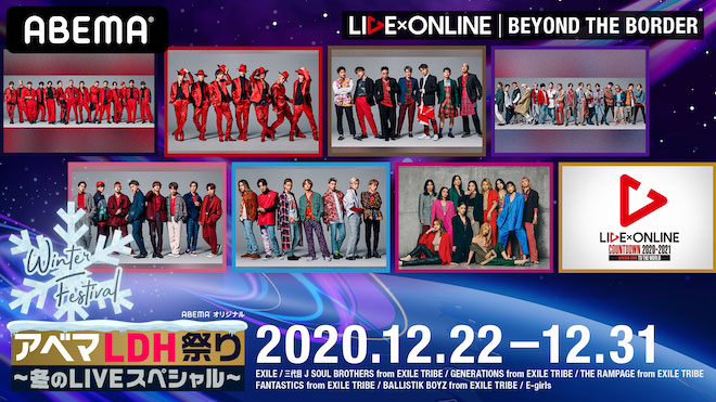 ABEMAでは<LIVE×ONLINE BEYOND THE BORDER>と題し、LDHアーティストのオンラインライブも配信する。こちらでは12月22日のTHE RAMPAGE from EXILE TRIBEからスタートし、12月23日にBALLISTIK BOYZ from EXILE TRIBE、12月24日のクリスマスイブには三代目 J SOUL BROTHERS from EXILE TRIBE、12月26日にFANTASTICS from EXILE TRIBE、12月27日にGENERATIONS from EXILE TRIBEが出演。