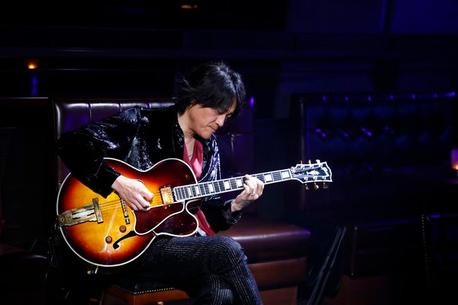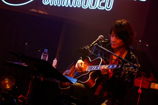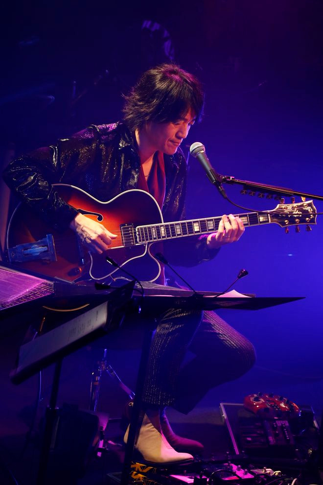 大人の夜が始まろうとする午後8時。プレミアムでスペシャルなワンマンライブの幕開けは、e-ZUKAのしっとりとしたジャズインストゥルメントから始まった。ブルーノート東京の客席で一人、スポットライトを浴びるe-ZUKAが手にしていたのは、古今東西のジャズミュージシャンに愛されているフルアコースティックギター。まろやかな音色で奏でられたのは、ジプシー・スウィングの創始者として知られる名ギタリスト、ジャンゴ・ラインハルトの名曲「Nuages」。テクニカルなロックギタリストとして知られるe-ZUKAのジャズプレイも絶品だ。