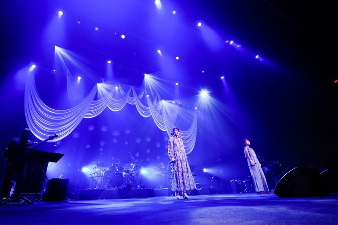 アンコールも、『マクロス』一色の展開に。アカペラ始まりの「アイモ」からスタートすると、曲の終わりにスペシャルゲストの鈴木みのりが登場。そのまま、『マクロスプラス』の「VOICES」と間髪入れずに入っていく。「VOICES」は、「マクロス25周年記念ライブ」のステージで中島が歌唱した、思い出の曲。菅野よう子が書いた『マクロス』シリーズ屈指の名曲でもあり、それを『マクロスΔ』のヒロイン、フレイア・ヴィオンを演じた鈴木みのりとデュエットするというのが熱い。