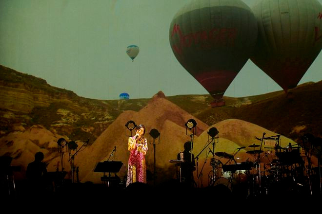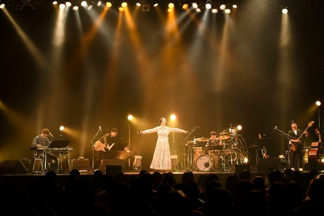開演時刻ぴったりにメンバーと坂本真綾がステージに登場。1曲目は「宇宙の記憶」で、ウッドベースとピアノの音色が素敵なアコースティック・アレンジに乗せて、会場は一気にジャジーなムードに。スリリングな旋律を歌いこなすと、間奏では華奢な体を揺らして踊る姿もとてもキュート。「ようこそお越しくださいました!」と挨拶すると、「今日は鬼の3公演!2日で6公演!」と笑った。一人でも多くの方に安心して観てもらいたいという想いから70分×1日3公演というハードなことになっているが、秋にミュージカル(3時間×昼夜2公演)を経験しているからそんなに大変に感じないというのだからさすが。今年でデビュー25周年だが、彼女の歌声はまだまだ進化する。この日も生き生きとした美しい声を放ち、特に高音のファルセットが豊かで気持ちがいい。その声で〈今しかできないことをすぐにやらなくちゃ〉と歌う「Million Clouds」や、〈会いたい日は会いたいって言おうよ〉なんてフレーズが光る「幸せについて私が知っている5つの方法」など“今聴かせたい曲”を次々と披露していく。彼女自身、「お客さんの前で歌うと、音楽をやっているなって気がします」と言っていたが、音楽は、作ってリリースして、それで終わりじゃない。こうして今を生きている人に直接届け、直接受け取ることでしか味わえない喜びがあるのだ。世界中が不安に包まれているこの時代に、聴こえ方が変わってしまった音楽もあるだろう、でもそれをネガティヴに捉えるのもポジティブに捉えるのもアーティスト次第。その後も「私へ」など、今年の7月にリリースした25周年記念アルバム『シングルコレクション+アチコチ』をあらためて聴き直しながら、彼女自身が今の感性に触れたという曲を届けてくれた。