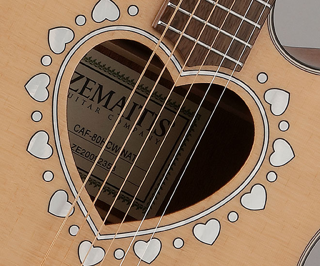 ゼマイティスの伝統的なハート型のサウンドホールの周りに特徴的なハートを散りばめたデザインと、マスターシュ・ブリッジのオリジナル・デザインは非常に魅力的。ハイ・フレットでの演奏を考慮したカッタウェイを採用したボディ・シェイプは、デザイン的にも個性を主張する。