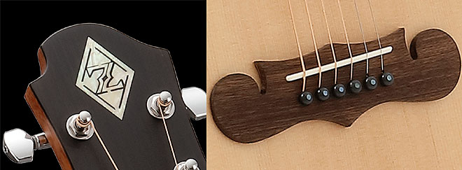 ▲ヘッドストックにはマザー・オブ・パールのZEMAITISロゴ(左)。英語で口ひげを意味する「マスターシュ」と名付けられたブリッジ(右)は、耐久性とサウンドの広がり、デザイン性を併せ持つ。