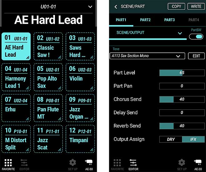 ▲専用アプリ「Aerophone Pro Editor」で音色選択やエディットが可能。