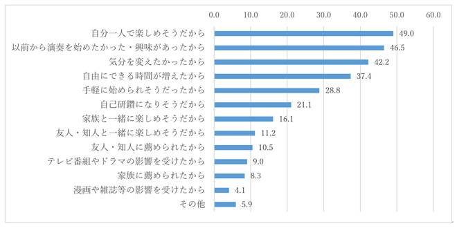 そもそもなぜ楽器を始めたのか、その理由をきくと、最も多かった理由は「楽器さえあれば自分一人で楽しめる」というもの。「以前から演奏を始めたかった・興味があった」という楽器への憧れから始める人や、「自由にできる時間が増えたから」「気分を変えたかったから」といった外出自粛期間中に自分の時間を楽しむために始める人も多かったようだ。