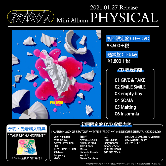 また、初回限定盤付属DVD『AUTUMN JACK OF SEA TOUR ~TYPE-E (FROG)~』at LINE CUBE SHIBUYA(2020.01.26)の収録楽曲も公開。自身初のホールライブがフルボリュームで収録される。ジャケット写真と最新アーティスト写真も合わせて公開された。ジャケット写真は、割れた陶器から4つの“フィジカル=物質”が流れ出しており、アーティスト写真はその“フィジカル=物質”をメンバーそれぞれが被った印象的なデザイン。