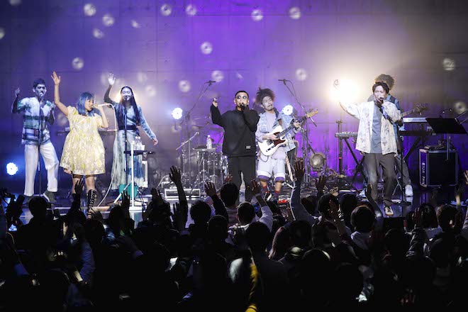 「but×××」から後半戦に差し掛かると、ゲストとしてホーン隊が追加。演奏に興じるメンバーたちは、アイコンタクトしながら呼吸を合わせたり、向き合ってソロバトルを繰り広げたり、その間他の人が煽るようなしぐさをしたり……と、とにかく楽しそうだ。そして「これだけじゃないんです。もうひとかた、スペシャルゲストをお呼びしております!」と、11曲目では、PESが登場。