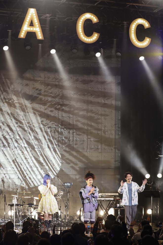 メンバーの3人、そしてベース、ドラム、キーボード2人、コーラス2人のサポートメンバーが入場。PORINの合図で照明が落ちると、ステージにいるメンバーらが一斉に特徴的なリズムで手拍子。突然の始まりに驚いていた観客も次第に手拍子で音楽に加わり、リズムがフロアにも伝播していく。