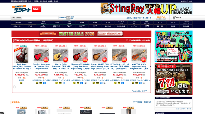 楽器演奏をたしなむのならば、休日は楽器店巡りが趣味という人も多いのではないだろうか。大型店で最新楽器に触れ、そのすごさを実感し、中古店で幻のヴィンテージ楽器と出会う。そんなひとときは何ものにも代えがたいだろう。ところがしかし、昨今はコロナ禍もあり、ささやかな楽しみもままならず……。そんなときに役に立つのが「デジマート」。簡単に言ってしまえば、楽器に特化したインターネット上のショッピングモールで、その品揃えはなんと、約34万点! 自宅に居ながらにして楽器店巡りが楽しめてしまうという楽器好きには垂涎のサイトだ。
