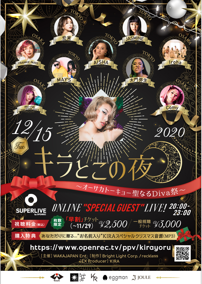 2020年12月15日(火)に大阪 club JOULEと東京 shibuya eggmanの2会場を中継する、大型オンラインライブイベント<キラとこの夜 2020 ~オーサカトーキョー聖なるDiva祭~>。東西の人気女性シンガー10組が、クリスマスをテーマにしたこの日だけのスペシャルライブを生配信でお届けするオンラインイベントとなっており、以下の豪華アーティストが出演予定となっている。
