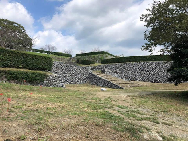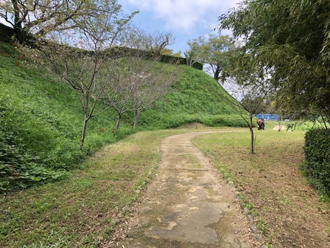 城の裏手に松尾山という曲輪があり、ここは本丸よりも若干だが高さがある。本来はこっちが本丸だったという説もあるが、確かにそれらしい作りにはなっている。山側の見張り台として機能し、多聞櫓が建てられていたそうな。出入り口も三つもあり、北の丸に向けて二つ、三の丸に抜けられる道が一つ確認出来た。虎口もある。もしかすると松尾山の麓の北の丸の高さが通常の曲輪の高さであって、本丸の丘は北の丸を隠すように土塁として土を盛って積み上げたのではないか?とイマジン。北の丸は女性や子供が暮らす御殿があったそうだが、松尾山と本丸の丘に囲まれて守りやすいように作ったとも言えるかもしれない。ロケで訪れた時にこの北の丸では松原健之のファン層ど真ん中な感じのお爺さんとお婆さんのゲートボール大会が繰り広げられていた。その中をカメラで撮影しながら進んでいくと、