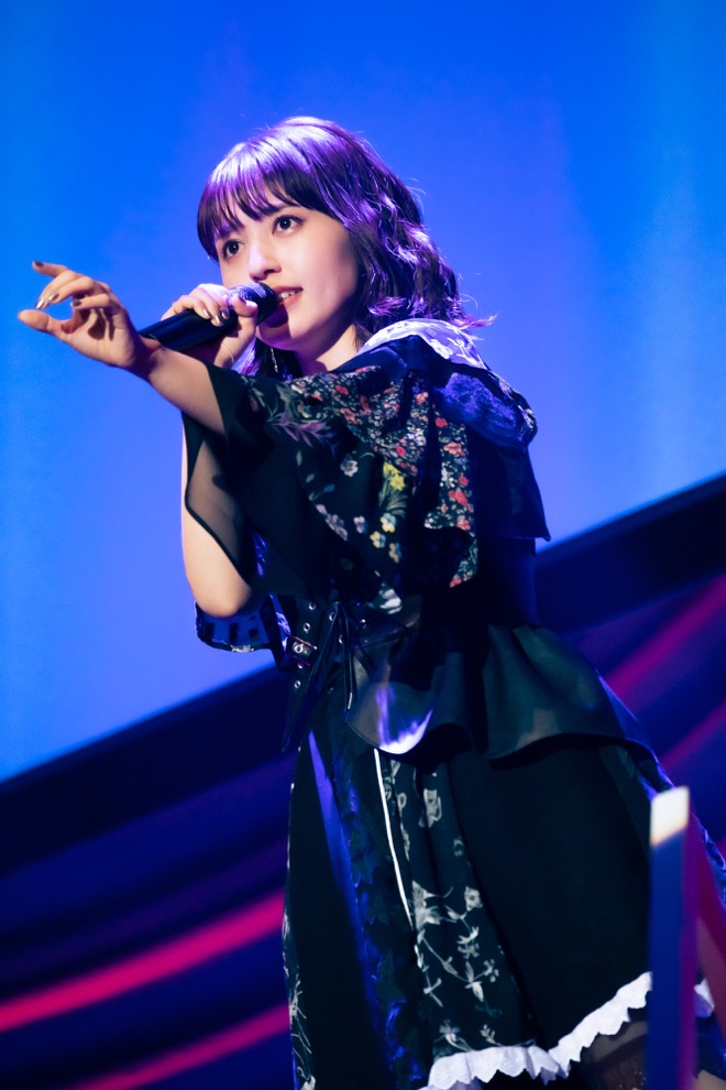 そしてステージ上のバンドから視線を上げると、ステージ上段には黒のドレスに身を包んだ逢田が立つ。彼女のボーカルもまた、この曲とこのバンドの音圧に負けないぐらいパワフルなものだった。ステージを踏み締めて立つような佇まいからまさに全身で声を発するように、パワフルでありながら彼女らしいしなやかさも聴かれるその声に、観客も序盤から一気に引き込まれていく。過去に観客を前にしたステージでは、およそ1年前にオフィシャルメンバーサイト“Us”の公式イベントでも披露していて、そのときも成長を感じさせるパフォーマンスが見られたのだが、今回はそこからさらに進化した、実に驚くべき表現をステージ上で見せていた。歌唱についてはもちろん、音に乗せたステージングや観客とのやりとりなど、中野サンプラザの広い舞台を存分に活かしたものになっていて、本来公演が行われるはずだった4月から8ヵ月でさらに自身を仕上げていったのだろう、力強いパフォーマンスが序盤から展開されていった。