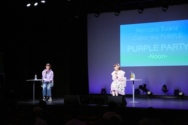 「紫色のものを身に付けてご来場ください」というドレスコードが設けられていた本イベント。昼公演<PURPLE PARTY -Noon->では、パーカーやマスク、ネクタイなど、それぞれお気に入りの紫色のアイテムを身に着けたファンが集まり、諏訪ななかの登場を待った。