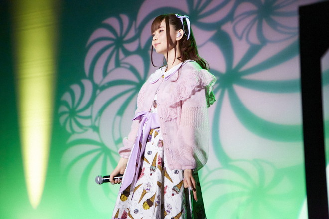 さらにライブの思い出として、「早替えのときの当日リハで事件が起きて……。ティーバッグタイプの喉に良いお茶をペットボトルに用意してくれていたんですけど、ストローを刺したときに、袋も破いてしまったんでしょうね。それを飲んだら口の中が茶葉でいっぱいになって(笑)。でも時間が迫っているから行かなければいけないとなって、そのまま出て、“マカロンラブ”を歌いきり、更に“ショコラ フレーズ”まで歌いました。でも私の口は茶葉でいっぱいでした」というエピソードを披露。会場も笑いを堪えながら聞いていた。なお、早替えの時間は40秒だったとのことだ。