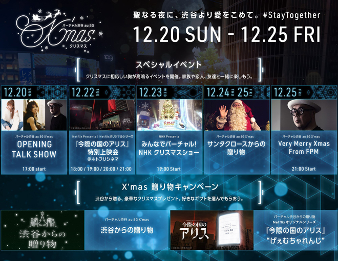 <バーチャル渋谷 au 5G X’mas>では、自宅にいながらもクリスマスの思い出をつくれるよう“バーチャル渋谷からのクリスマスプレゼント”をコンセプトとした、本物のサンタクロースからのフィンランド行きチケットプレゼントや賛同企業約25社より集まった「渋谷からの贈り物」、NETFLIXオリジナルシリーズ『今際の国のアリス』、NHKとのコラボイベントなど盛りだくさん。
