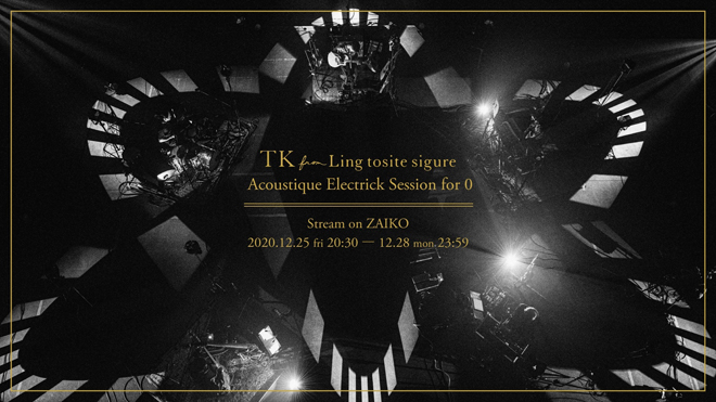 12月23日(水)にツアーファイナルを迎えるBillboard Liveでの公演<TK from 凛として時雨 Acoustique Electrick Session vol.2>の編成で行われる今回の配信ライブでは、すべての楽曲に原曲とは違うアレンジをTK自らが施し、2020年4月にリリースした最新アルバム『彩脳』からも選曲されているスペシャルセットを楽しむことができる。チケットは12月22日(火)正午から発売されている。