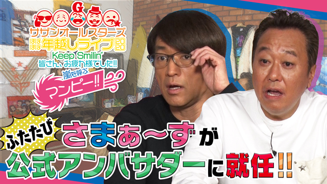 安全対策も含め、直前収録した無観客ライブを2020年12月31日(木)大晦日に配信するサザンオールスターズの<ほぼほぼ年越しライブ 2020「Keep Smilin’〜皆さん、お疲れ様でした!! 嵐を呼ぶマンピー!!〜」>をさらに盛り上げるべく、さまぁ~ずが、同配信ライブの公式アンバサダーをつとめることが発表された。