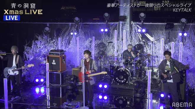 オープニングを飾ったKEYTALKは、「青の洞窟 SHIBUYA」を想起させるステージで「DROP2」、メディア初披露となった新曲「Orion」などを熱唱。ライブの感想を聞かれると「寒さを吹き飛ばすようなライブになりました。初披露の「Orion」も素敵な「青」の空間で演奏出来てうれしかったです!」とコメントした。また、スタジオでは、「音楽を通じた人との繋がり」をテーマにトークを展開。今年、人との繋がりを感じた曲について聞かれると「「流線ノスタルジック」という曲を配信した時に妹から「お前のわりには頑張ってるな」と連絡がきました。この曲が僕と妹を繋げてくれたと思います(笑)」と明かした。