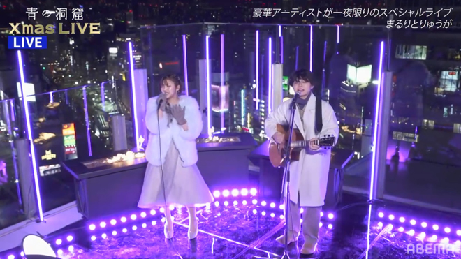 続いて登場したのは、SNS発の新世代アーティスト・まるりとりゅうが。渋谷の夜景をバックに、定番ソングの「気まぐれ時雨」、今年発表したミニアルバム『改めまして』から「嫉妬」と「ONE STEP」を披露。さらに、クリスマスならではのパフォーマンスとして「メリクリ」のスペシャルカバーも披露し、イベントを盛り上げた。スタジオトークでは「渋谷の夜景が本当に綺麗でした。後ろを向いて歌いたいくらいでした(笑)」とパフォーマンスを終えた感想をコメント。また、今年の音楽活動について「ずっとライブができなかったのですが、先月にツアーができて、ファンの皆さんと会えたのでよかったです。この期間だからこそできた曲もあったので前向きに考えています。」と振り返った。