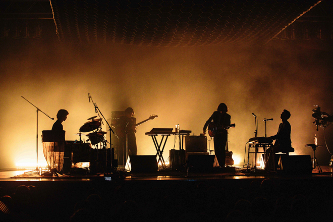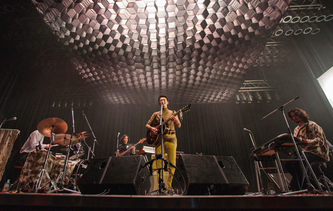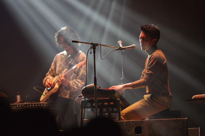 アルバムでもオープニングを飾っていた「独白」をSEに、最初は斉藤雄哉、田中慧、野元喬文の3人が姿を現し、少し遅れて荒谷翔大がキーボードの前に座ると、一曲目は彼らの認知度を高めた人気曲「矜羯羅がる」。ステージにはペルシャ柄の絨毯が敷き詰められ、メンバーはそれぞれジャケットを羽織り、スタイリッシュな雰囲気の中、続く「トキメキ」の艶やかなエレピの音色と、荒谷の色気のあるボーカルによって、一気にyonawoの世界へと引き込まれる。