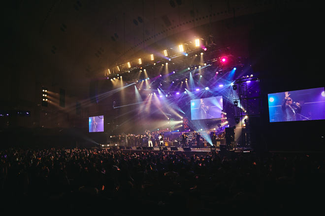 第二部では、木梨が「とんねるずメドレー」と題して、「雨の西麻布」を含む懐かしい4曲をパフォーマンス。その後も、江口洋介、藤井フミヤ・藤井尚之兄弟や、鈴木雅之、Bro.KORN、所ジョージ、宇崎竜童といった大ベテラン勢が続々と登場し、「木梨ミュージック コネクション2」収録曲をはじめ、名曲の数々を披露。木梨とのトークやセッションも交えつつ、それぞれに存在感のあるボーカルで歌い上げ、会場中がその歌声に酔いしれた。