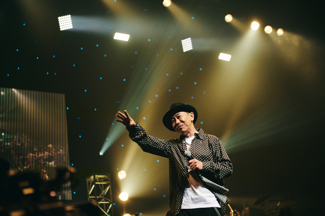 開演時刻の15時になると、スクリーンには最新EPの収録曲「生きてるうちが花なんだぜ」が流れる中、この日の出演者の名前が次々と映し出され、早くも拍手と歓声が上がる。ステージには豪華フルバンドでのセットが組まれ、会場中に赤いペンライトが光り輝く中、木梨憲武がダンサーを従えて登場。「ようこそ!」という声とともに「GG STAND UP!!」を披露し、このライブの幕が開けた。