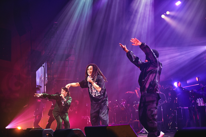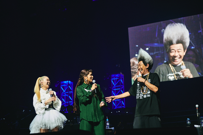 中盤では、AKLO、中元みずき、AI、AK-69、DOBERMANといった、年代やジャンルの垣根を超えた多彩なアーティストが次々と登場し、迫力ある歌声やサウンドで観客の心を掴んでいく。木梨も様々なスタイルに着替え登場し、アーティストたちとのパフォーマンスを盛り上げた。