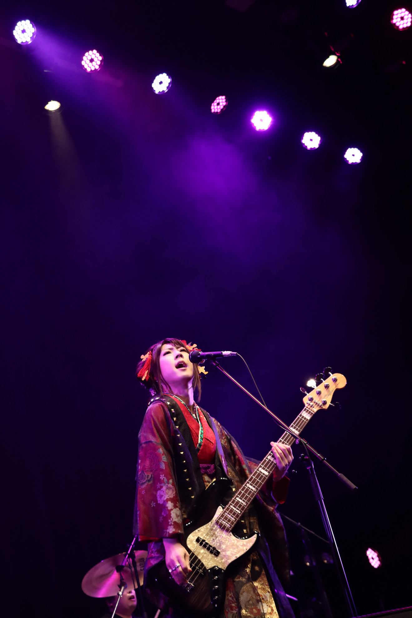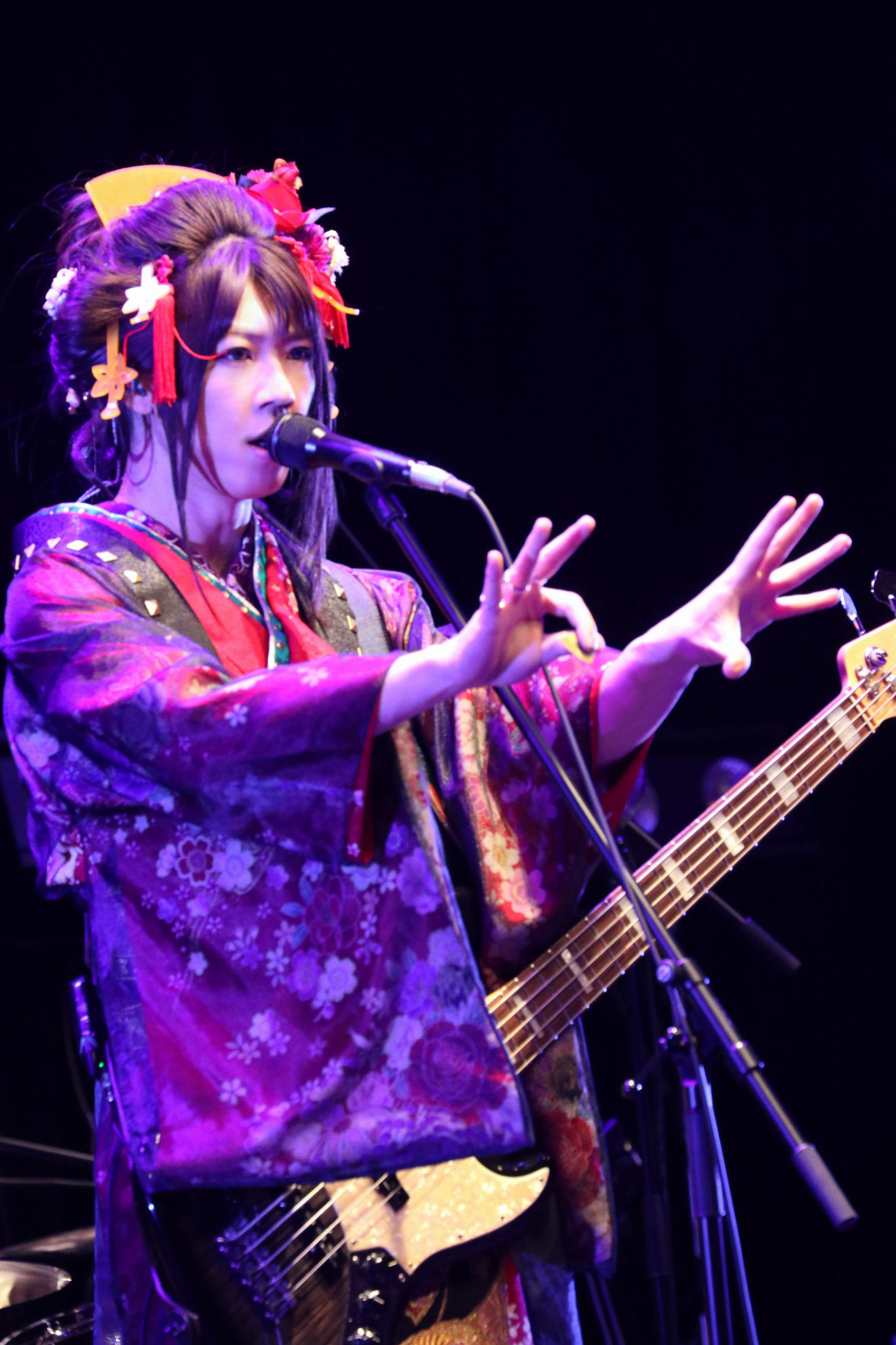 暗転した客席をペンライトの光が灯す中、メンバーがステージに登場すると、そのまま「明正フィロソフィー」からライブがスタート。ジャジーな曲調に乗せて、艶やかな装いの亜沙がベースを弾きながら落ち着いたトーンで歌い始めると、広末慧(Gt)、横浜利憲(Gt)、優一(Dr)という昨年の<亜沙バースデーライブ 2019~雪蛍~>にも参加したおなじみの面々が安定感のある演奏で曲を盛り上げていく。間髪入れずに「明正ロマン」へとなだれ込むと、亜沙らしい和洋折衷スタイルで会場を包み込み、観る者を唯一無二の世界へと引きずりこむ。