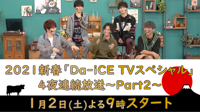 また、1月1日〜1月4日の間、YouTubeにてトータル150分尺の新感覚バラエティ番組『Da-iCE TVスペシャル』を4日連続でプレミア公開中のDa-iCE。第二夜となる今夜は『2021新春Da-iCE TVスペシャル4夜連続放送!~Part2~ <聴覚編>』がプレミア公開される。